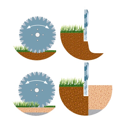 - Ten rodzaj układów tnących cechuje relatywnie niższa prędkość ostrza tnącego i ceniony jest dzięki temu za spokojną pracę bez odrzucania ziemi, żwiru lub piasku.