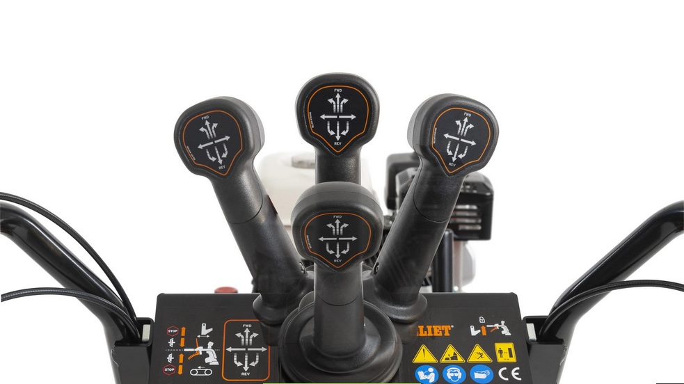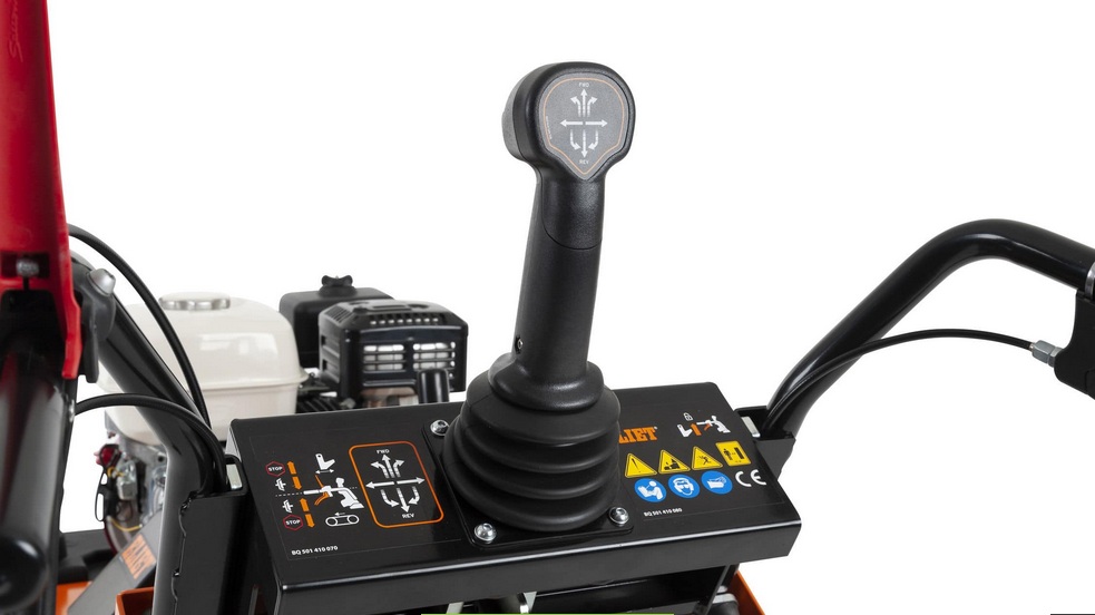 Sterowanie jest bardzo proste. Lewa ręka steruje sprzęgłem napędu trakcji i noża. Prawa ręka jest wolna do sterowania maszyną przy pomocy centralnie umieszczonego dżojstika.