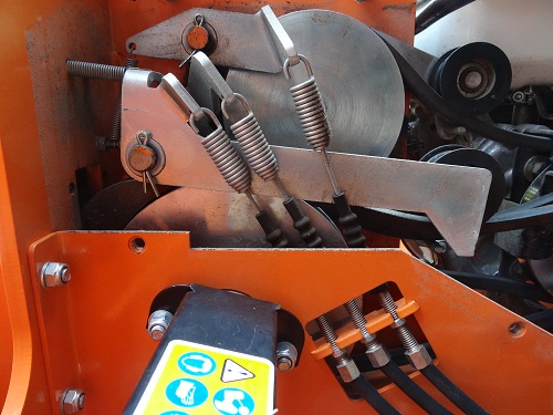 Widok po zdjęciu osłony pasków napędu. Po prawej końcówka linki napędu pompy. Po lewej 2 końcówki linek napędu brony.
