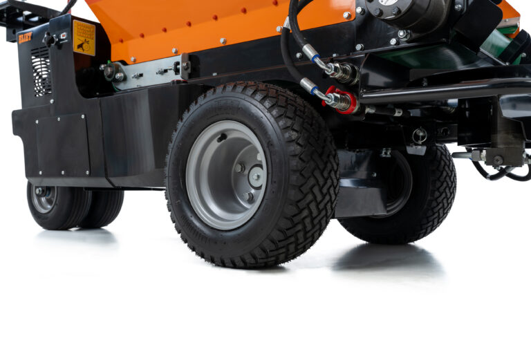 W pełni napędzany hydraulicznie. Firma ELIET zdecydowała się wyposażyć swoją maszynę EcoCureTM w bezobsługowe napędy hydrauliczne. W związku z tym maszyna została wyposażona w duży, 15-litrowy zbiornik oleju. Ta duża objętość oleju zapewnia stałą, niską temperaturę pracy całego układu hydraulicznego, gwarantując optymalną wydajność w każdej sytuacji. Szerokie opony. Firma ELIET zdecydowała się na wyposażenie kół trakcyjnych w bardzo szerokie opony do jazdy po trawie z bieżnikiem 260 mm. Te szerokie opony pneumatyczne zapewniają minimalny nacisk na podłoże, zapobiegając powstawaniu kolein.