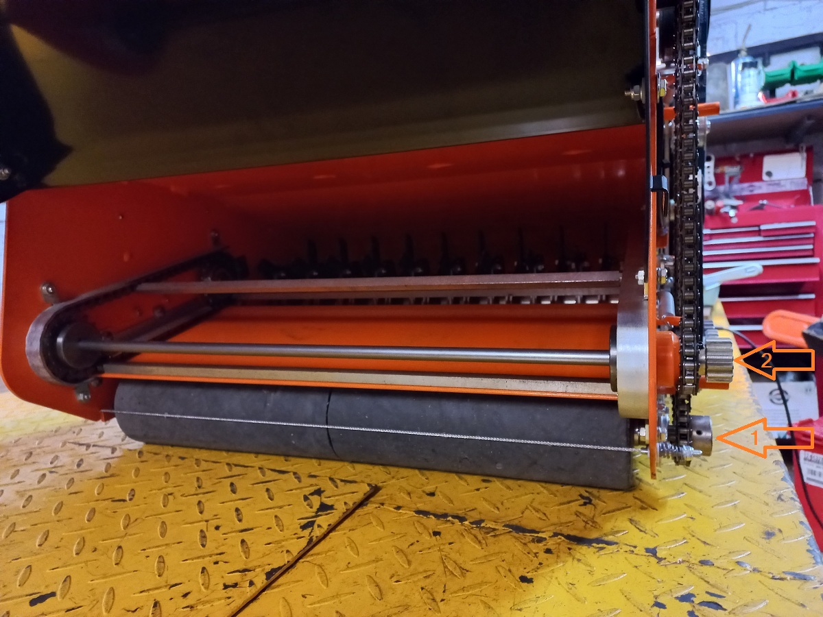 Napęd łańcuchowy (1) rolki jezdnej i (2) przenośnika odpadu