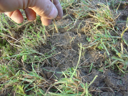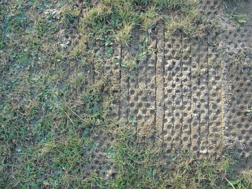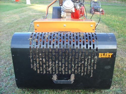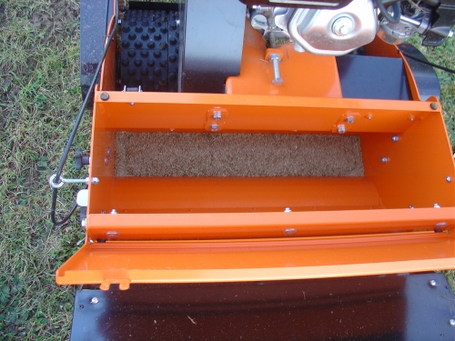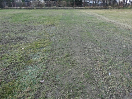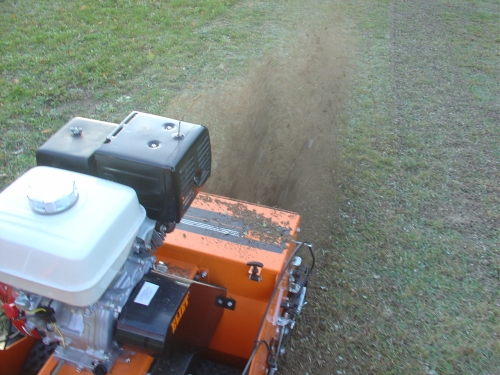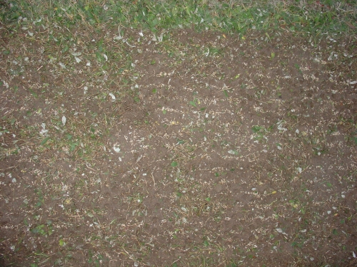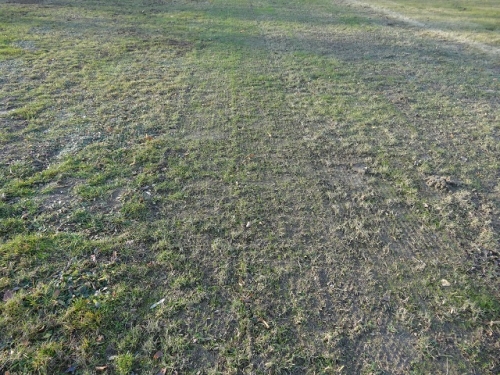 Widok po 1-2 tygodniach (tutaj niestety bez nawadniania!). Widać wyraźnie rządki wykiełkowanej trawy w wyciętych przez noże rowkach. Dowodzi to skuteczności podsiewu. Większość nasion trafia do rowka, zostaje przykryta i ma idealne warunki do wykiełkowania.