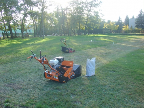 Do przygotowania nawierzchni wykorzystujemy kosiarkę ze zbieraczem. Wykaszamy trawę na najniższej możliwej wysokości