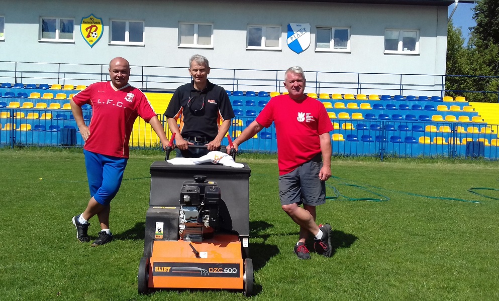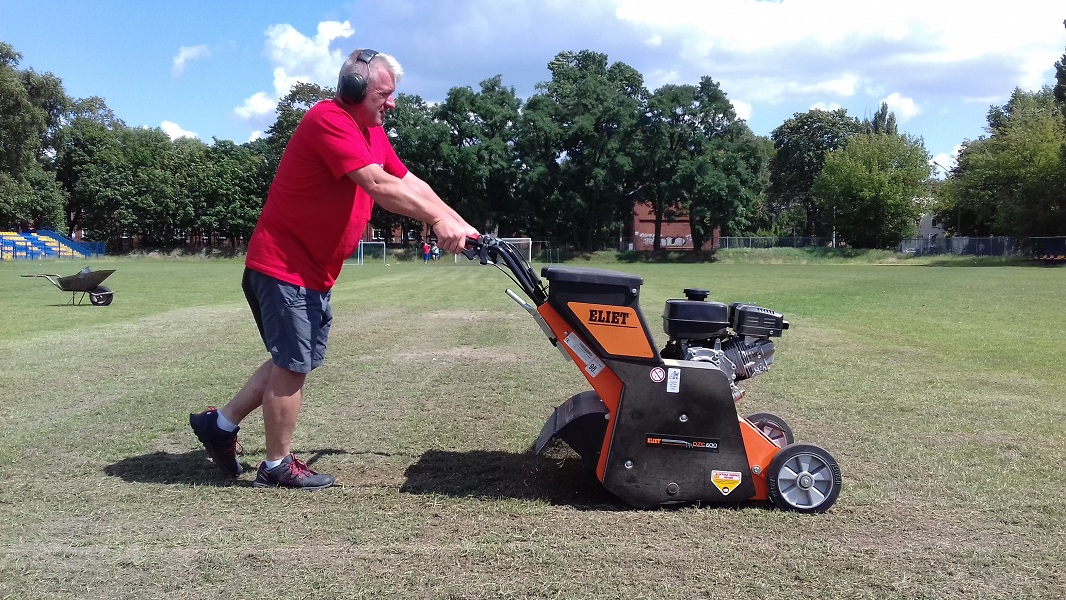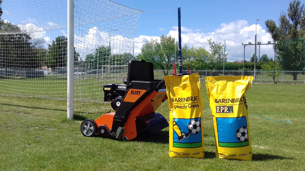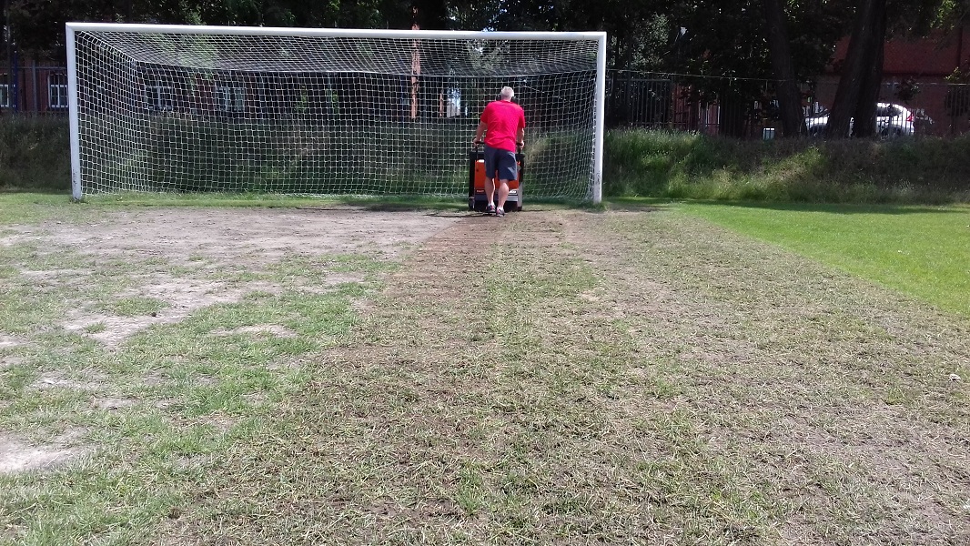 Tradycyjnie najbardziej zniszczona nawierzchnia to centralne obszary pola karnego boiska, które mogły zostać wyłączone z eksploatacji na okres 1 miesiąca. Do renowacji wykorzystaliśmy nasz pokazowy egzemplarz podsiewacza do dosiewu wgłębnego ELIET DZC600 i dostarczone przez gospodarza obiektu nasiona firmy Barenbrug (specjalna mieszanka traw przeznaczona do szybkiej renowacji boisk piłkarskich). Wykonano też top dressing torfem.